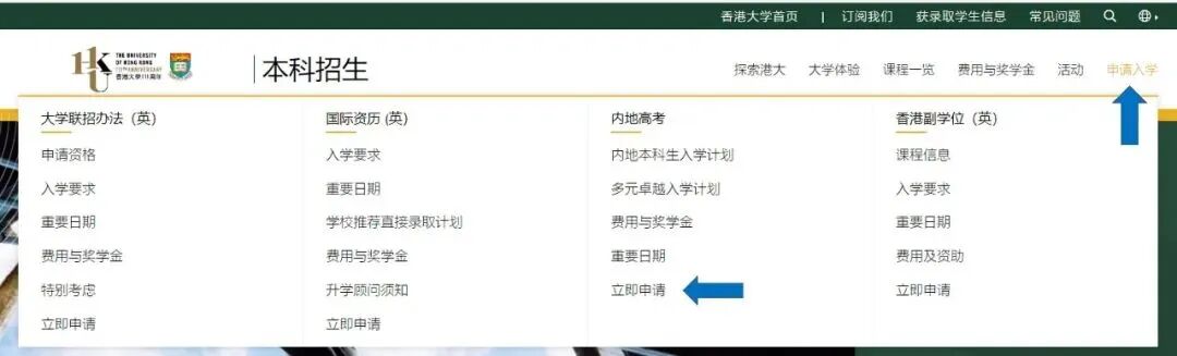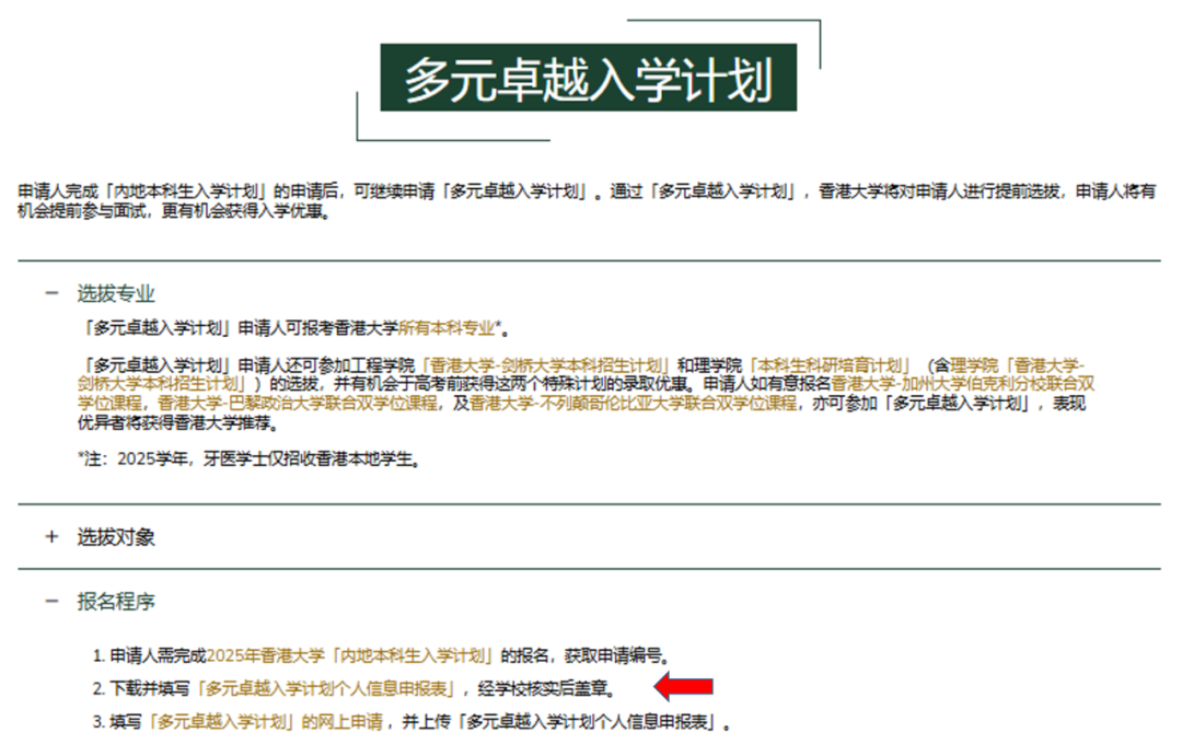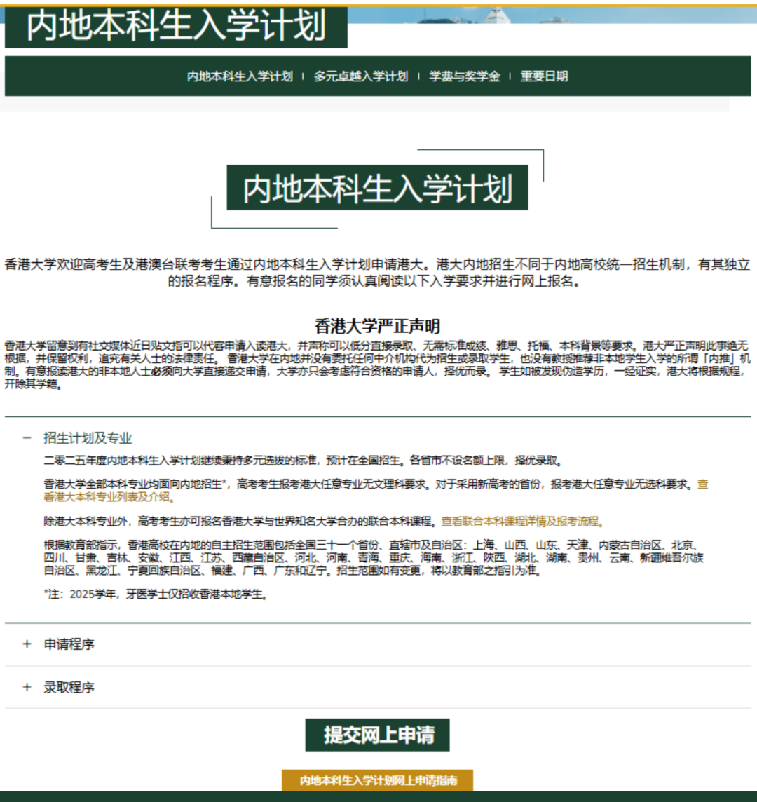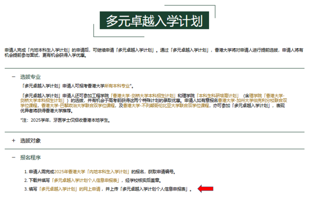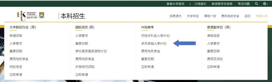 1)进入www.hku.hk/mainland,在顶部菜单栏点击“申请入学”>“多元卓越入学计划”。