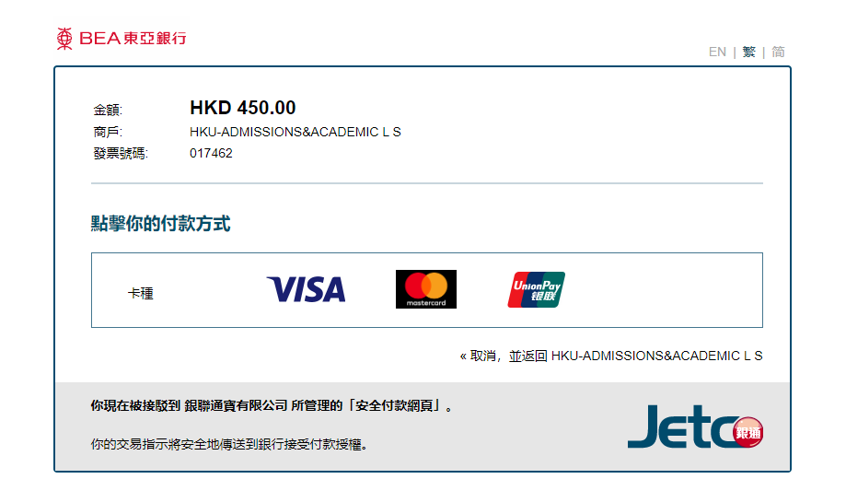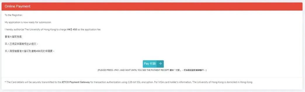 完成付款后,您将收到一封确认邮件,包含十位数的申请编号(如:15XXXXXXXX),以及付款参考号码;