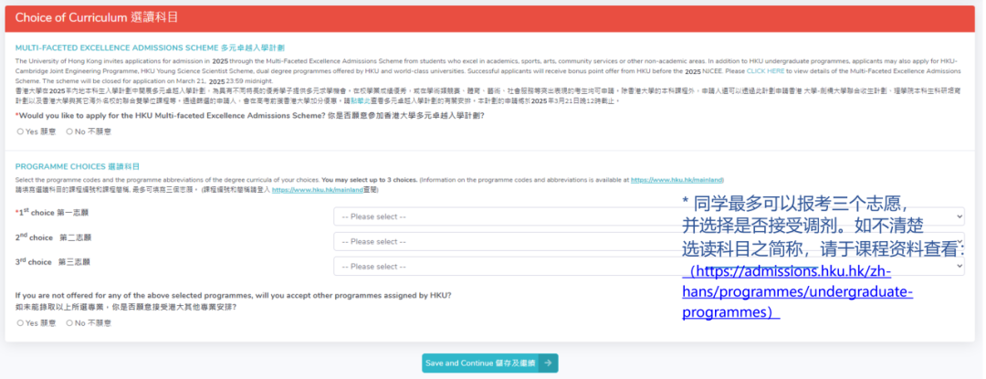 学生最多可以报考三个志愿,并选择是否接受调剂。如需查询专业简称和编号,请登入www.hku.hk/mainland,选择“课程一览” 查看。