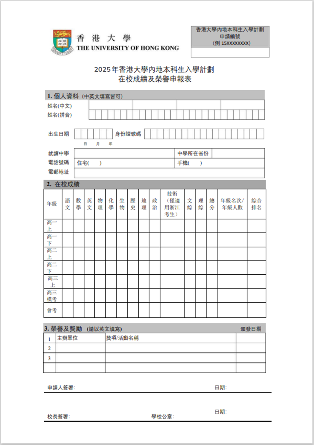 6)在校成绩:如实填写在校成绩、年级排名和综合排名,尚无结果的栏目可留白。